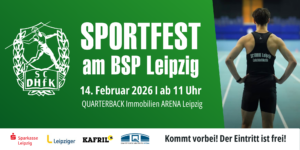 Ausschreibung: Sportfest am BSP Leipzig, 14.02.2026 Veranstalter/Ausrichter: SC DHfK Leipzig e.V., Abteilung Leichtathletikzentrum Wettkampfort: Quarterback Immobilien Arena Leipzig, 04105 Leipzig, Am Sportforum 1-3 Eingang zum Wettkampf über den Sportlereingang Westseite-arkplatz Wettkampf: Samstag, 14. Februar 2026 Beginn: 11 Uhr Meldung bis zum 09.02.2026 online über www.ladv.de Rückfragen per Mail an Tobias Groenewold: t.groenewold@lvsachsen.de Altersklassen/Disziplinen/Gebühren pro Disziplin [...]