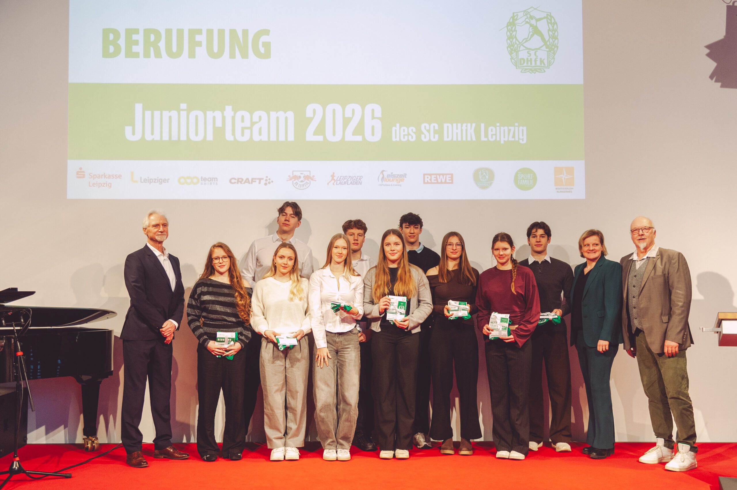 Neben den sechs Ehrungskategorien wurden erneut auch 22 junge Nachwuchsportlerinnen und -sportler des Vereins ins „SC DHfK Juniorteam 2026“ von Premiumsponsor Sparkasse Leipzig berufen und dürfen sich u.a. über ein Gutscheinheft mit vielen Angeboten freuen. „Mit der Berufung ins Juniorteam möchten wir eine besondere Anerkennung und einen Dank an die jungen Athletinnen und Athleten aussprechen, die mit hervorragenden Leistungen im vergangenen Jahr auf sich aufmerksam gemacht haben. Gleichzeitig ist es auch eine Wertschätzung für die Arbeit, die in ihrem Umfeld geleistet wird und eine Motivation für ihren weiteren Weg“, sagte Joachim Erdmann, Vizepräsident Leistungssport.